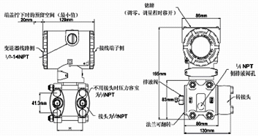 例:TDSB3051差壓變送器,量程0-300kpa,兩線制4~20 mA DC信號(hào)輸出,法蘭接頭、排氣/排液閥、隔離膜片均為316不銹鋼,智能表顯示器管裝平支架,泄放閥在壓力室側(cè)面的橢圓接頭內(nèi)螺紋NPT 1/2