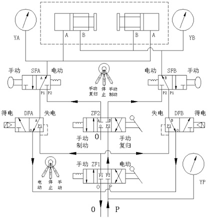 手動制動:電磁閥在失電的狀態(tài)下,方可轉(zhuǎn)為手動操作。至手拉閥SFA、SFB、轉(zhuǎn)閥ZF1于手動狀態(tài),當(dāng)滿足機(jī)組停機(jī)條件時,轉(zhuǎn)閥ZF2轉(zhuǎn)到手動制動狀態(tài),使氣體進(jìn)入制動腔,制動器動作加速機(jī)組停機(jī)。