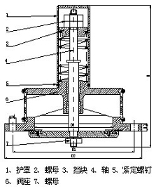 用螺絲刀旋開序號(hào)5的兩個(gè)緊定螺釘,拆開序號(hào)1護(hù)罩,按開啟真空度要求,固定序號(hào)4軸,松開序號(hào)2螺母,調(diào)整好擋塊,調(diào)完畢并緊定序號(hào)2螺母,蓋上序號(hào)1護(hù)罩,鎖緊序號(hào)5的兩個(gè)緊定螺釘。彈簧作用力在真空為5-10KPa時(shí)即能打開,當(dāng)真空值超過20-30KPa時(shí)閥門全開,當(dāng)閥門下部有水,靠水的浮力自動(dòng)關(guān)閉。