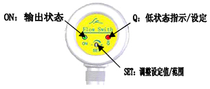 3、待流速穩(wěn)定后,調(diào)節(jié)“SET”螺絲,使流量開關(guān)從Q狀態(tài)(紅燈亮)剛好轉(zhuǎn)入ON狀態(tài)(綠燈亮)。