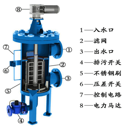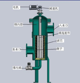 的排污閥;馬達(dá)帶動(dòng)本體濾網(wǎng)內(nèi)的兩把不銹鋼刷轉(zhuǎn)動(dòng),被濾網(wǎng)所